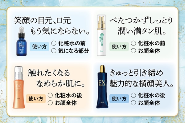 乾燥や寒さで肌悩みが表れやすい季節。年齢とともに深まる肌悩みに寄り添う4種類の美容液をご用意しました。