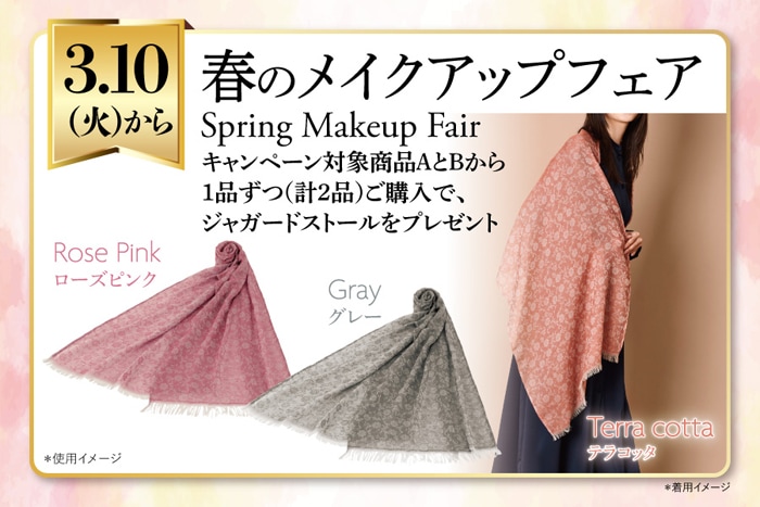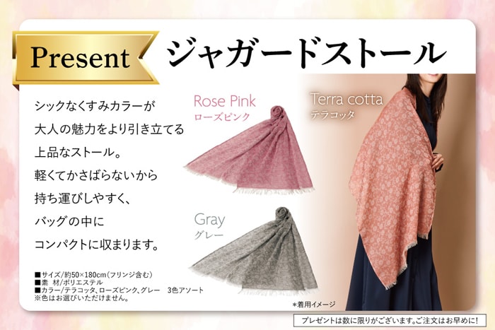キャンペーン対象商品AとBから1品ずつ(計2品)ご購入で、シックなくすみカラーの『ジャガードストール』をプレゼントいたします。